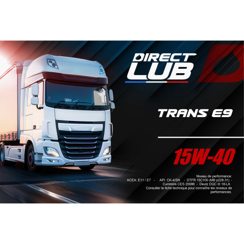 La Trans E9 15w40 est une Huile Moteur minérale de technologie Low Saps, de très hautes performances générales. Spécialement adaptée pour les moteurs DIESEL, fortement suralimentés, des camions Poids Lourds à faibles émissions (Euro IV et Euro V), équipés ou non de Filtre à Particules.
